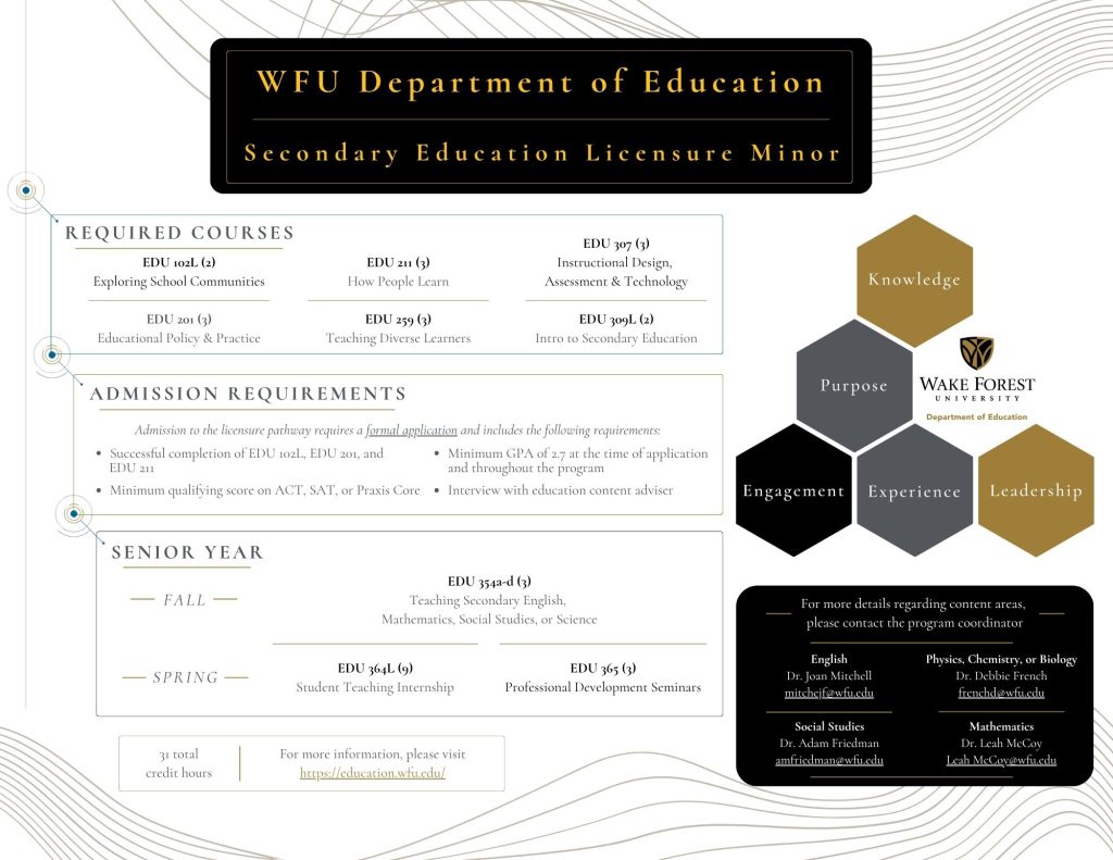 Students interested in teaching high school (grades 9-12) English, mathematics, science, or social studies will complete the 31-hour undergraduate licensure minor and a content area major (or equivalent coursework) in their respective field. Upon graduation, students will be recommended for a North Carolina teaching license.