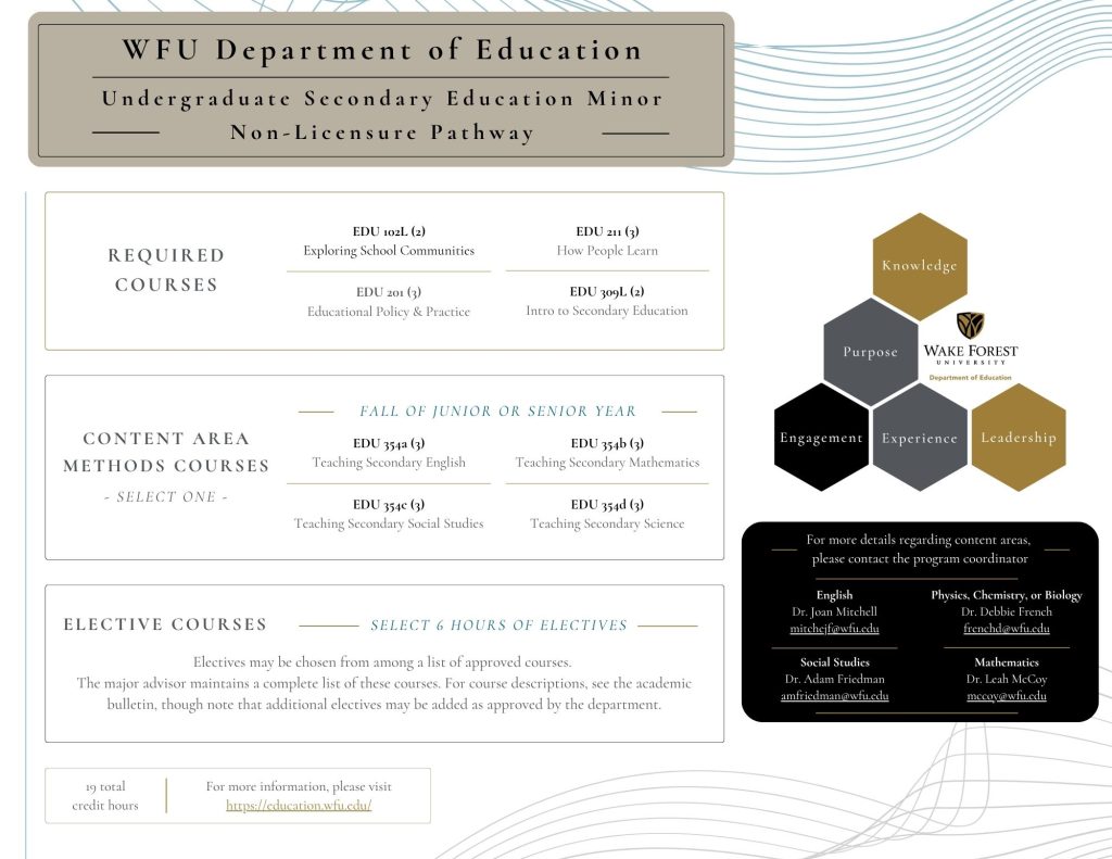 The Secondary Education Non-licensure Pathway is perfect for undergraduate students with an interest in teaching and/or grades 9-12 education but who do not plan to student teach or pursue a teaching license as an undergraduate. This 19-credit hour pathway is different from the licensure pathway in that it does not require a full-semester of student teaching and related coursework and therefore does not lead to a North Carolina teaching license.